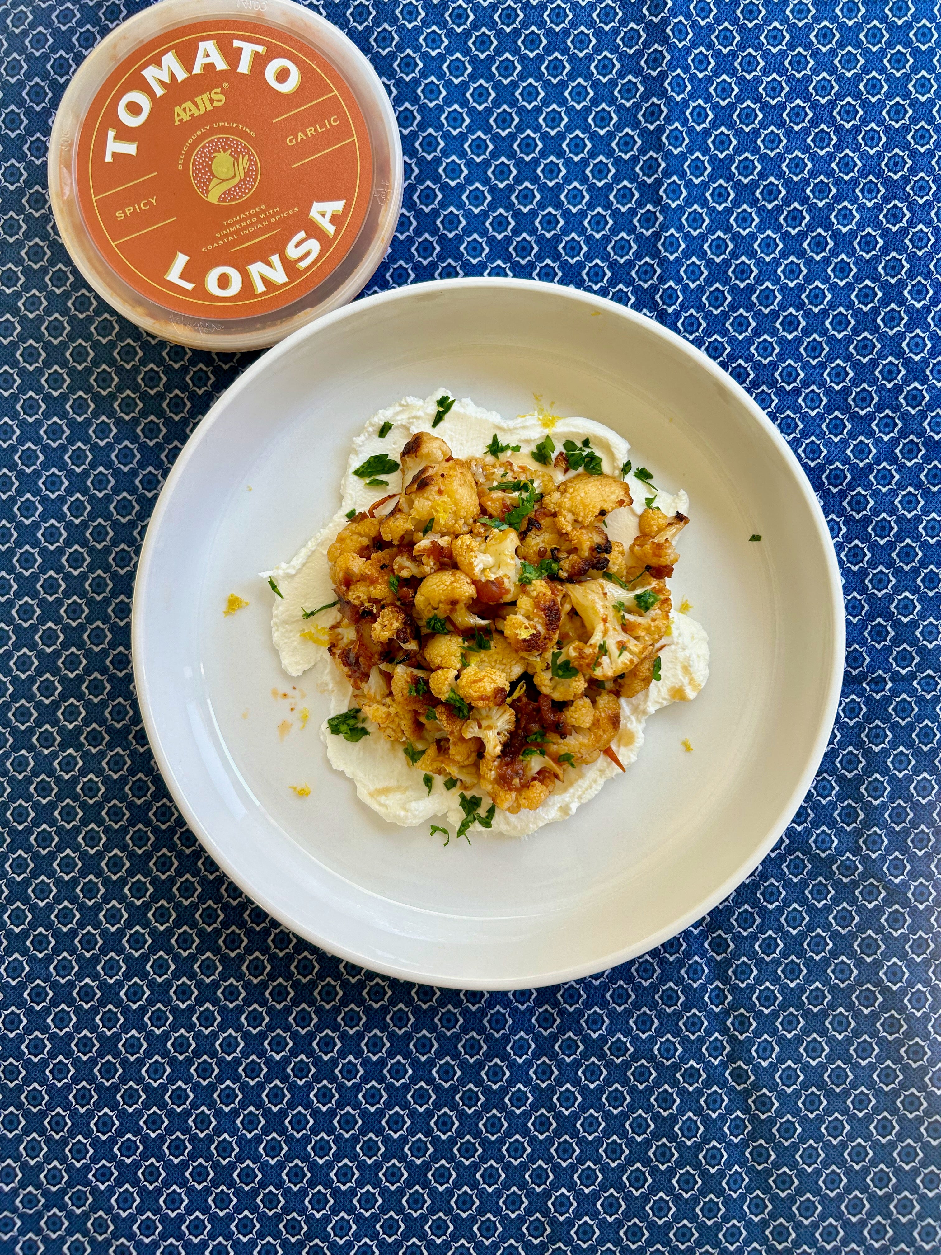 Grab a large bowl and simply toss 2 cups of cauliflower florets with a generous amount of olive oil and your favorite Tomato Lonsa (we used Spicy Garlic).